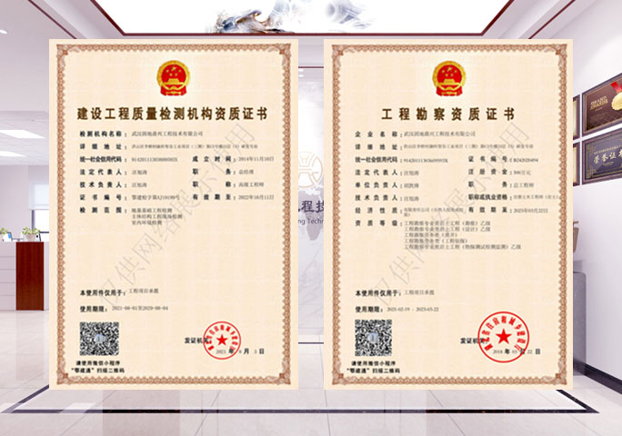 武漢固地鼎興工程技術有限公司成立于2014年11月,是國家高新技術企業、同時也是中國地質大學(武漢)工程學院產學研基地,是一家專門從事工程物探、水文勘察、工程檢測、監測(自動化)、地震評價等業務的綜合性公司。目前公司持有湖北省市場監督管理局頒發的CMA計量認證證書(地基基礎工程檢測、主體結構工程現場檢測、室內環境檢測),湖北省住房和城鄉建設廳頒發的建設工程質量檢測機構證書,巖土工程勘察、設計、物探測試檢測監測資質,以及勞務類(鑿井、工程鉆探)資質,同時也是地震安全性評價官方授權從業單位...